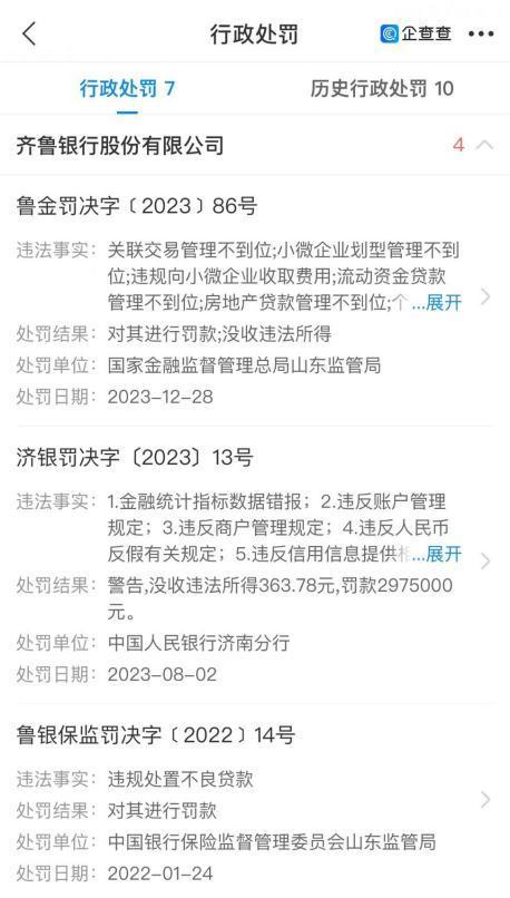 其中,2019年11月,齐鲁银行因违反《反洗钱法》相关规定,被中国人民银行济南分行营业管理部处以罚款30万元,并对1名直接责任人罚款2.5万元;2022年1月,齐鲁银行因违规处置不良贷款行为,被中国银行保险监督管理委员会山东监管局处以罚款110万元;2023年12月,永城齐鲁村镇银行有限责任公司因流动资金贷款回流至保证人、借款人,被国家金融监督管理总局商丘监管分局处以罚款30万元。