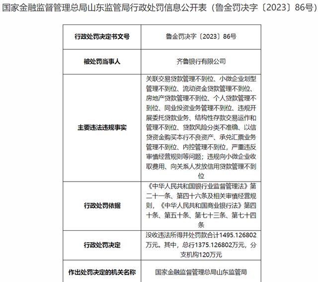 近日,国家金融监督管理总局山东监管局的公开处罚信息显示,齐鲁银行股份有限公司(以下简称“齐鲁银行”)因存在关联交易贷款管理不到位、小微企业划型管理不到位等14项违法违规行为,总行及分支机构总计被没收违法所得并处罚款合计1495.126802万元。其中,贷款管理不到位成为齐鲁银行此番被罚的问题“重灾区”,占比超40%。