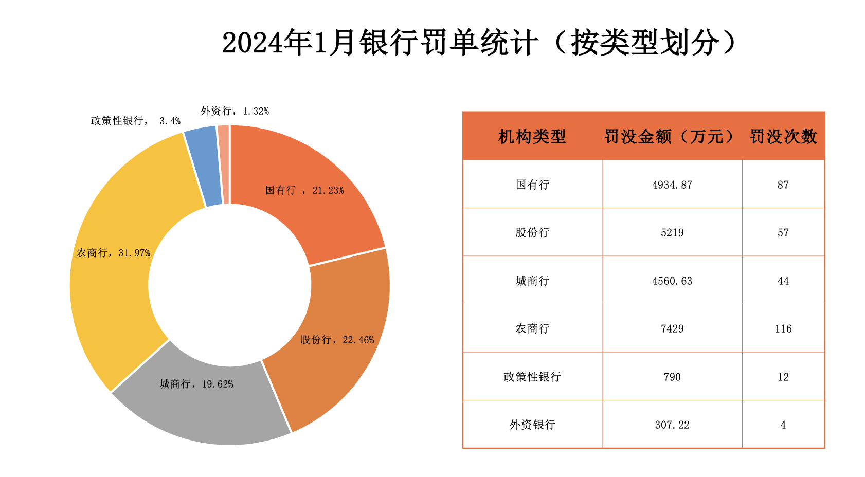 分银行类型来看,1月农商行以7429万元的罚款金额位列当月银行被罚没总额的第一位,股份行和国有行则分别以5219万元和4934.87万元的罚单金额紧随其后。