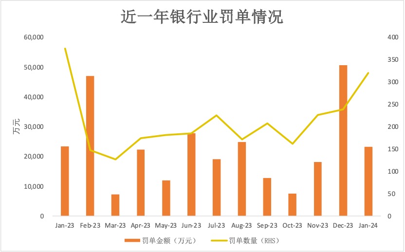 2024年1月(以罚单公布时间为准),国家金融监督管理总局、央行以及外汇管理局3家监管机构共计对154家银行开出320张罚单,合计罚没23240.72万元,罚单数量是2023年2月以来的最高值。