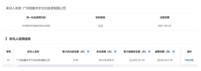 据上海票据交易所显示,截止到今年6月底,华宇集团持股80%的广州凤凰华宇文化投资有限公司商票累计逾期3581万元,逾期余额3002万元;