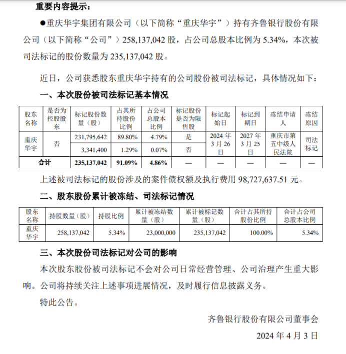 虽然在7月初解除了2.25亿股的司法标记和516万股的司法冻结,但随即在7月9日又将3189万股齐鲁银行股权进行了质押,截至目前,华宇集团持有的2.58亿股中,有2.35亿股仍然处于质押状态,剩下2300万股则是司法冻结状态。