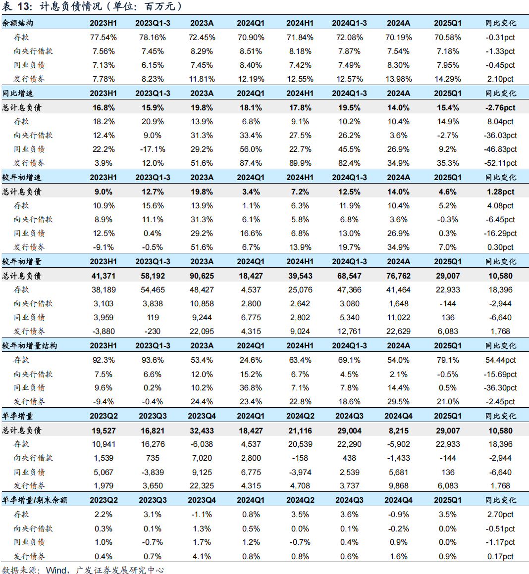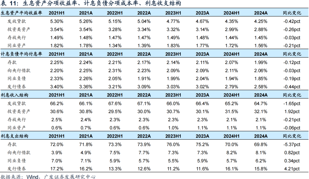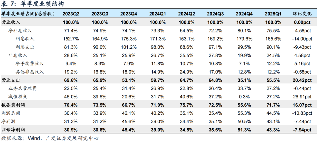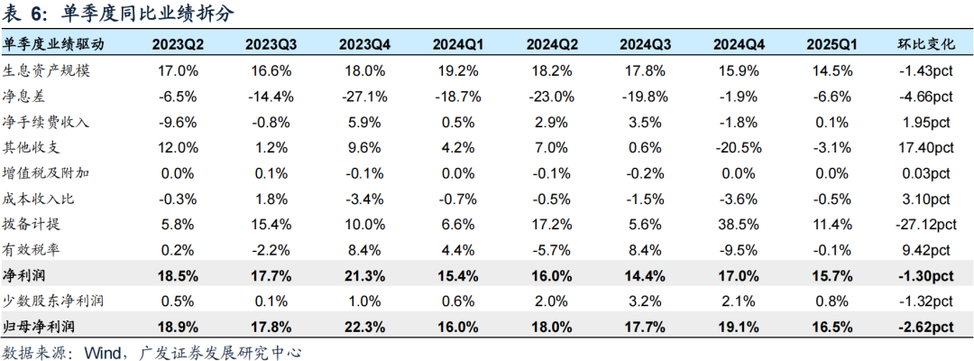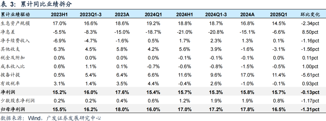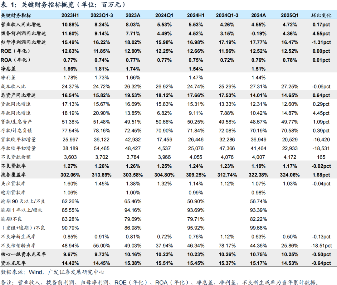 亮点:(1)存贷两旺。24A/25Q1末贷款同比分别增长12.3%、12.6%,25Q1单季度贷款增长205.29亿元,占24年全年增量的55.6%,同比增多30.7亿元,主要贡献在对公,25Q1末对公贷款同比增长18.1%,增量贡献达105.4%,零售贷款较年初缩量28.47亿元。24A/25Q1末存款同比分别增长10.4%、14.9%,25Q1单季度存款增长229.33亿元,同比增多183.96亿元。(2)息差降幅明显收窄,利息净收入同比增速回正。24A公司净息差1.51%,较24H1/23A下降3bp、23bp,降幅明显收窄。资产端,24A生息资产收益率3.50%,较24H1/23A分别下降12bp、34bp;负债端,24A计息负债成本率2.06%,较24H1/23A分别下降9bp、12bp,公司做好存款成本管控,合理安排市场化资金,息差下降压力得以缓解。在规模扩张稳健和息差降幅收窄背景下,24A/25Q1公司利息净收入同比正增长1.7%、7.9%。