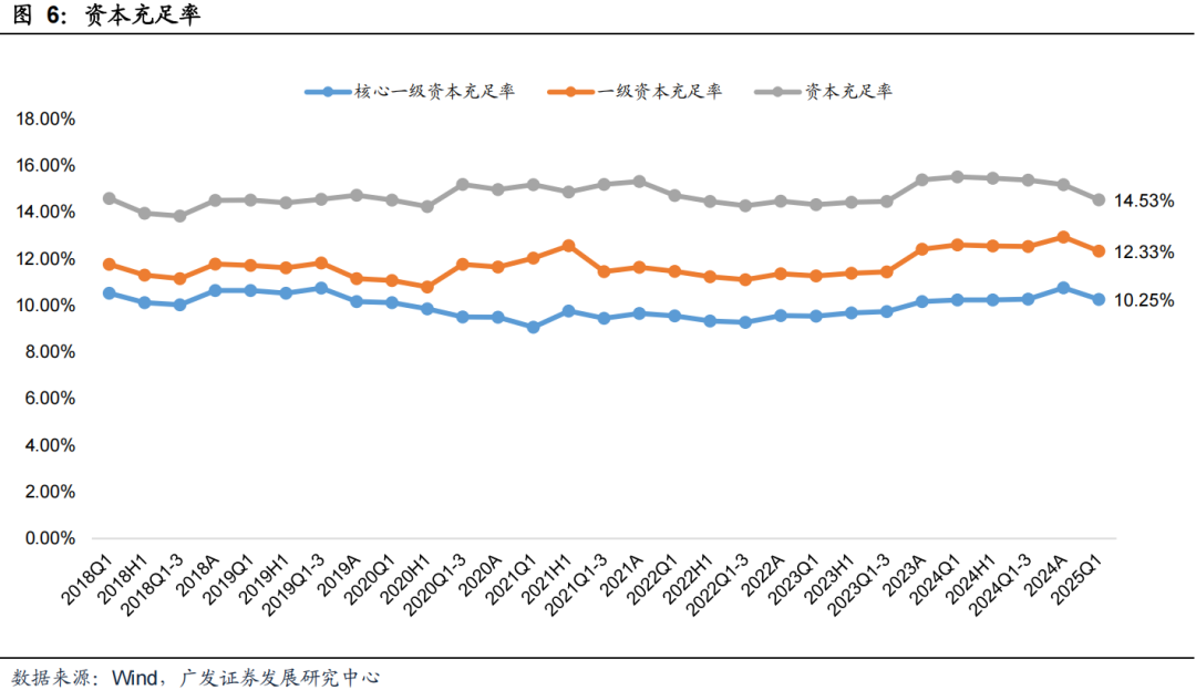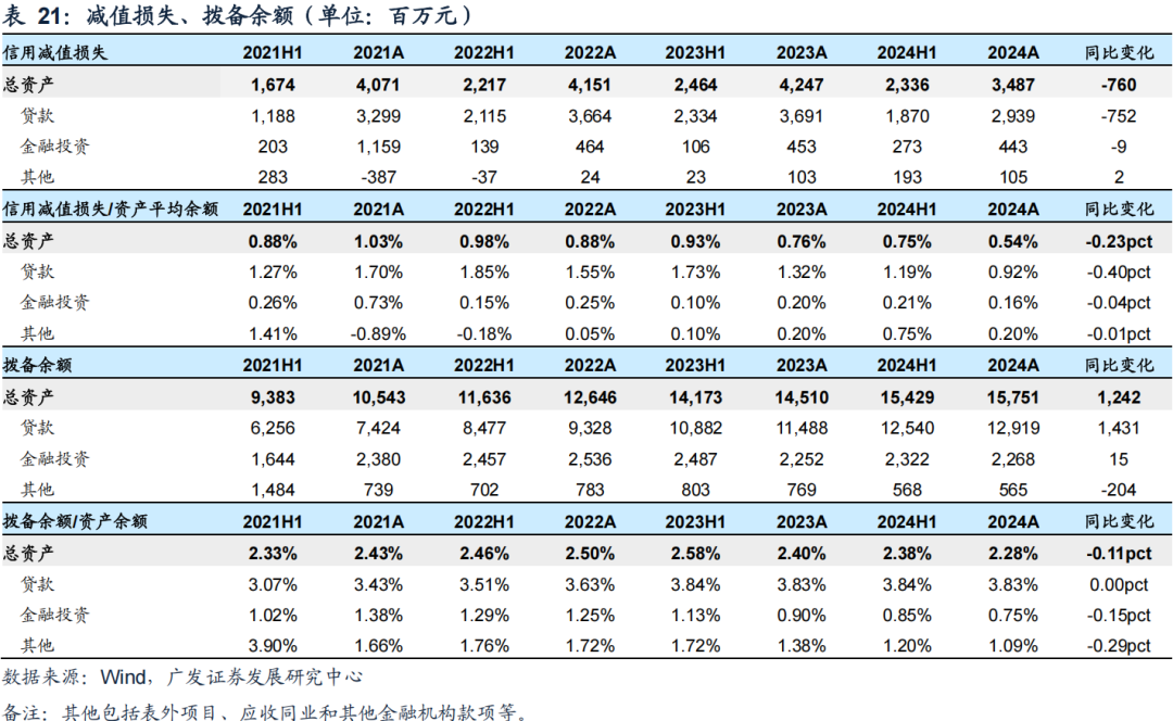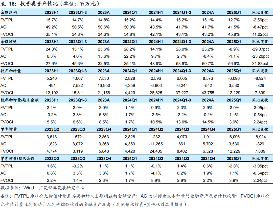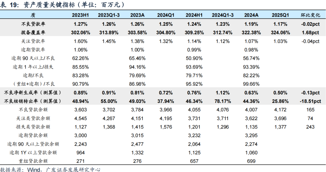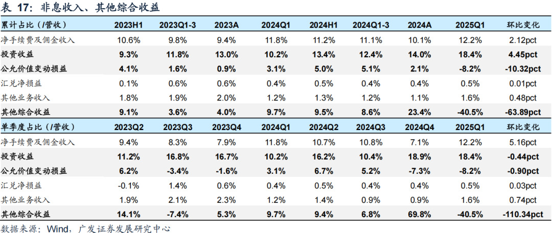 关注:(1)个别领域资产质量波动。25Q1末不良率1.17%,环比回落2bp;关注率1.03%,环比下降4bp;测算25Q1不良生成率0.50%,同比下降26bp;25Q1末拨备覆盖率324.06%,环比提升1.68pct,拨备余粮充足。分条线来看,24年末对公不良率0.95%,较24H1末下降31bp,其中制造业不良额较年初下降4.88亿元,房地产、建筑业不良额分别较年初增加2.02亿元、1.94亿元,主要受个别客户下迁不良影响;24年末零售不良率2.00%,较24H1末上行68bp,主要是居民收入增长面临不确定性,部分个人客户还款能力下降。(2)其他非息波动。24A/25Q1其他非息同比增长12.6%、-14.0%。 25Q1投资收益5.83亿元、公允价值变动损益-2.61亿元,分别占营收18.4%、-8.2%;24A/25Q1末其他综合收益较23A/24A末增长29.2亿元、-12.8亿元。