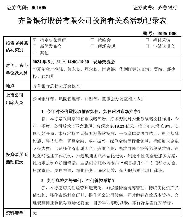 据齐鲁银行股份有限公司(以下简称“齐鲁银行”,601665.SH)昨日披露的信息显示,华夏基金、华创证券2家机构于5月21日对该行进行了现场调研。