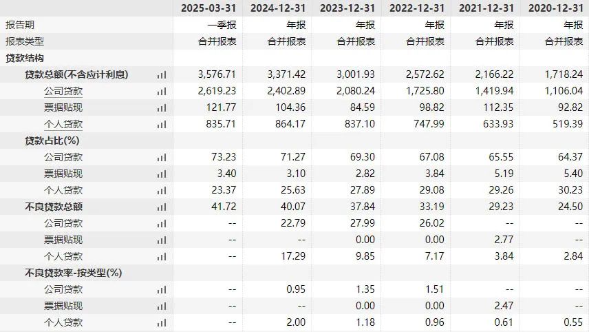 齐鲁银行似乎并未如业内那般进行信贷业务的零售转型,个人贷款占比从2020年末的30.23%、逐年降至2024年末的25.63%,今年1季度末又降至23.37%。而对公贷款(不含票据贴现)占比则从2020年末的64.37%、逐年提升至2024年末的71.27%,1季度末又升至73.23%。