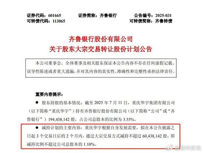近日,齐鲁银行发布公告称,公司股东重庆华宇集团有限公司(下称“重庆华宇”)根据自身发展需要,拟在本公告披露之日起 3个交易日后的2个月内,通过大宗交易方式减持不超过60438142 股,即减持比例不超过公司总股本的1.10%。