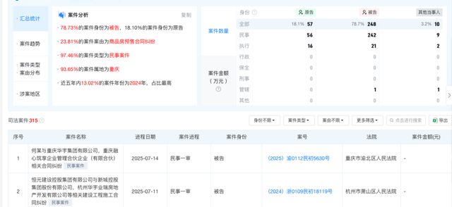 此外,据天眼查显示,重庆华宇当前所涉司法案件351件,78.73%的案件身份为被告;23.81%的涉案案由为商品房预售合同纠纷。