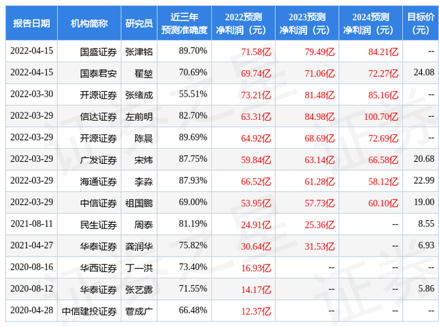 数据中心根据近三年发布的研报数据计算,国盛证券张津铭研究员团队对该股研究较为深入,近三年预测准确度均值高达89.7%,其预测2022年度归属净利润为盈利71.58亿,根据现价换算的预测PE为5.22。