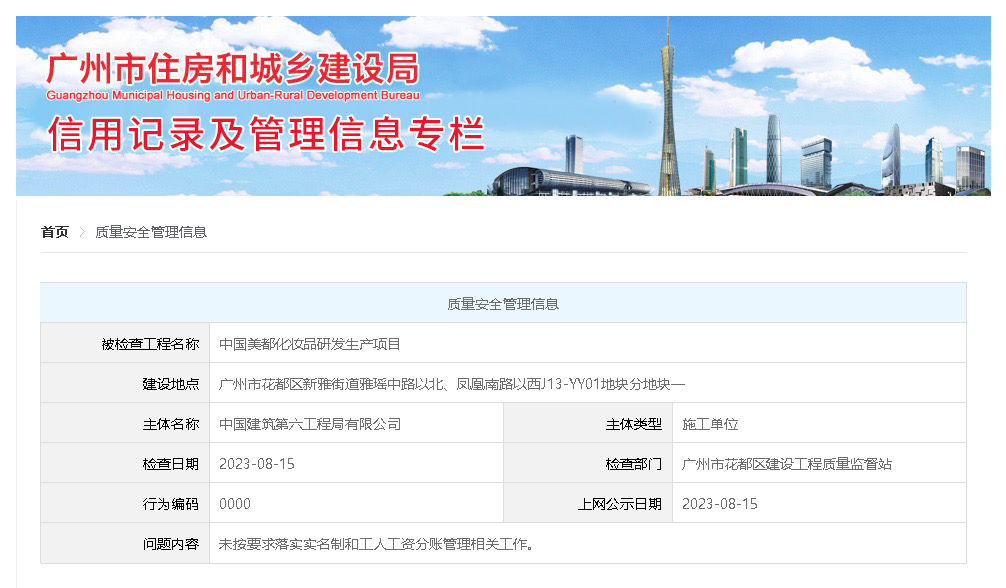 中国质量新闻网讯(高玉婷) 8月15日,广州市住房和城乡建设局信用记录及管理信息专栏公示了中国美都化妆品研发生产项目的质量安全管理信息相关问题。