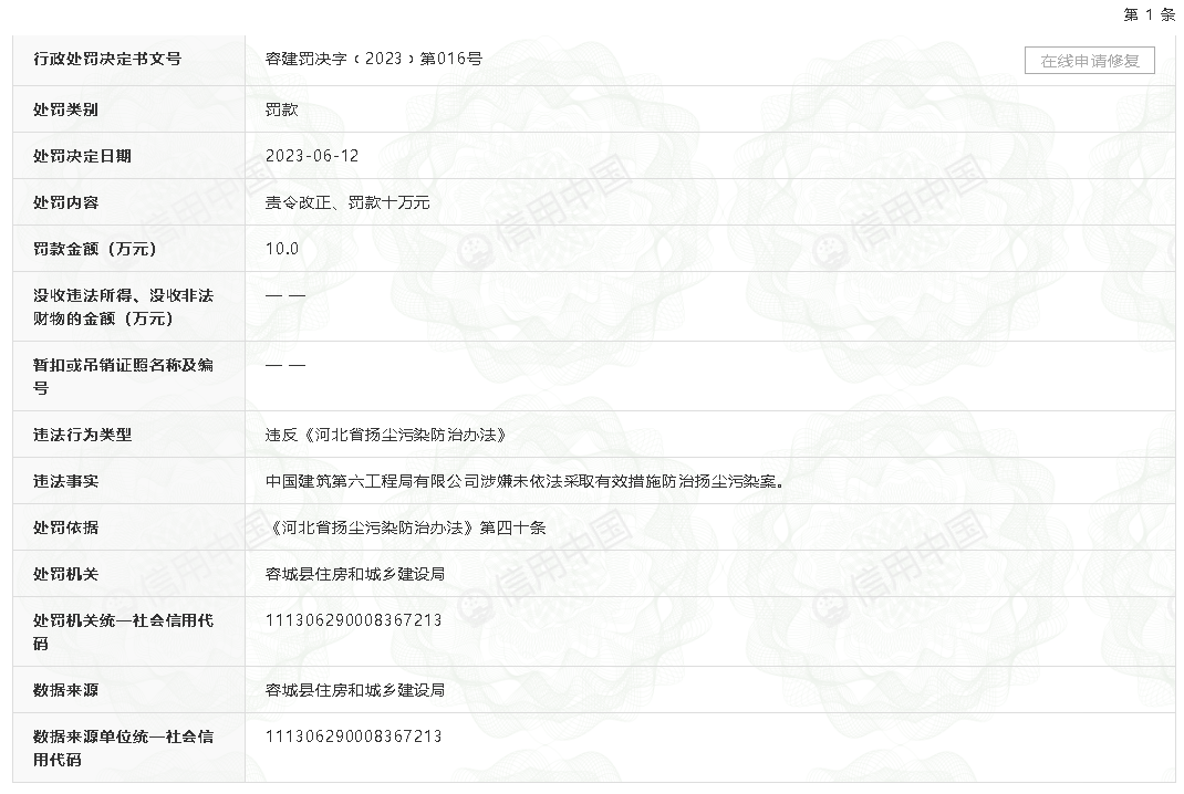 据了解,作为此次施工单位的中国建筑第六工程局有限公司先前还因涉嫌未依法采取有效措施防治扬尘污染被容城县住房和城乡建设局罚款十万元。
