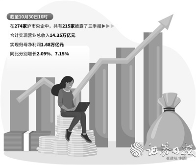随着A股2023年三季报披露接近尾声,沪市央企前三季度的业绩情况也浮出水面。数据显示,截至10月30日16时(下同),在274家沪市央企中,共有215家披露了三季报,合计实现营业总收入14.35万亿元,实现归母净利润1.68万亿元,同比分别增长2.09%、7.15%。