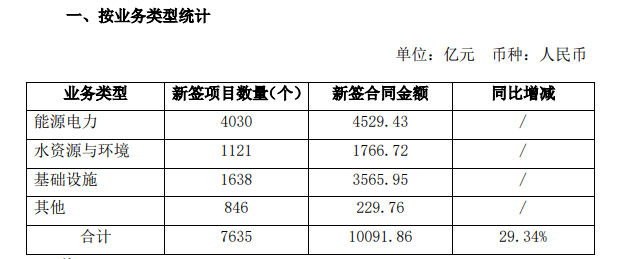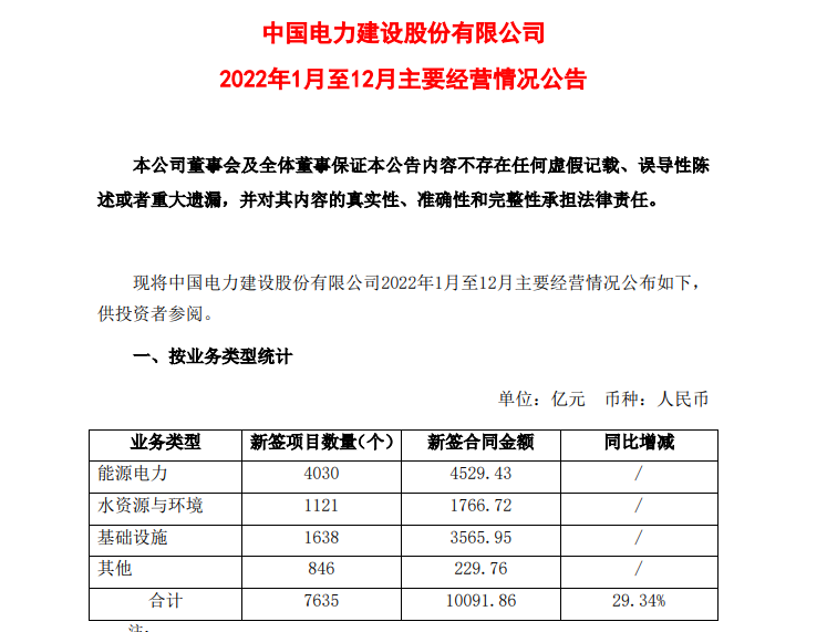 刚刚,中国电建股份有限公司(以下简称“中国电建”)发布最新企业公告,2022 年全年,中国电建累计完成新签合同额 10091.86 亿元,同比增长29.34 %。