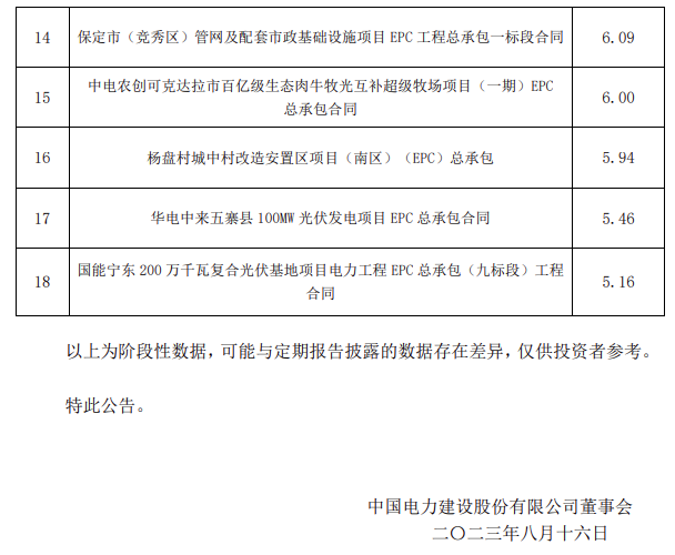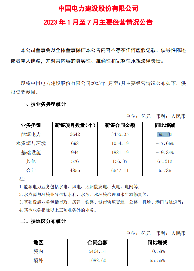 8月16日,中国电建发布《2023 年 1 月至 7 月主要经营情况公告》。