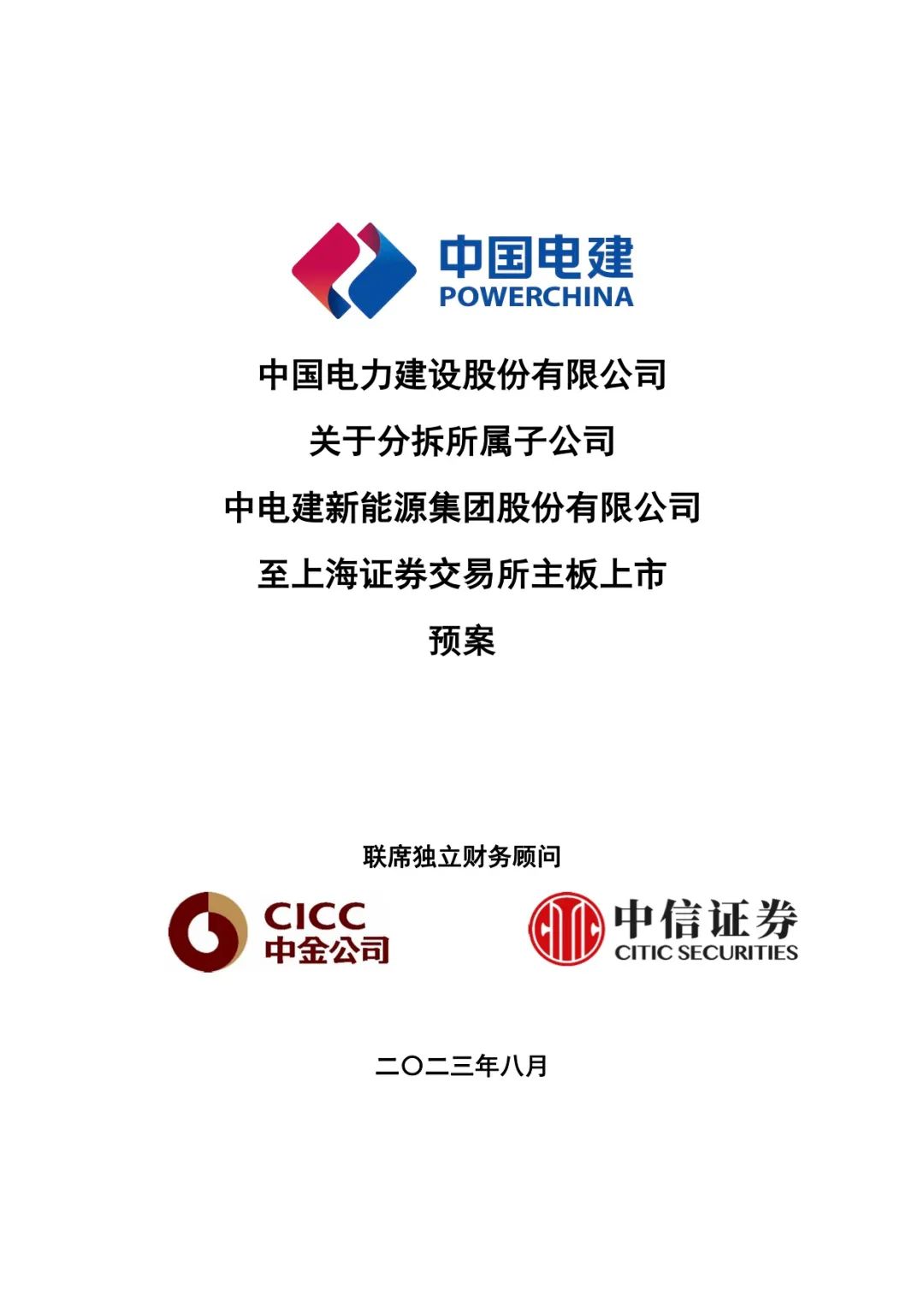 8月24日,中国电建发布分拆预案公告称,拟分拆所属子公司中电建新能源集团股份有限公司(简称“电建新能源”)至上海证券交易所主板上市。电建新能源将在获取上交所批准及中国证监会同意注册后择机发行。