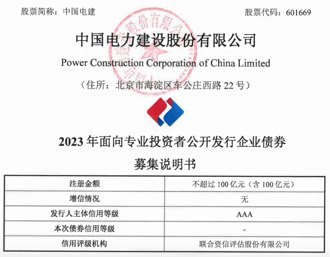 10月25日,据上交所,“中国电力建设股份有限公司2023年面向专业投资者公开发行企业债券”项目状态显示为“已受理”。