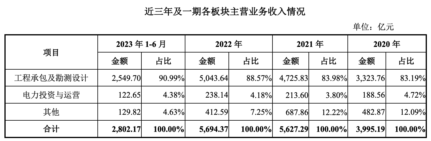 公司报告期内主营业务收入稳步增长,作为核心和优势板块的工程承包与勘测设计板块继续得到巩固和加强,2022年该板块营业收入占公司主营业务收入的比重约为89%。最近三年及一期该业务收入分别实现收入3,323.76亿元、4,725.83亿元、5,043.64亿元和2,549.70亿元,增长率分别为17.50%、42.18%、6.72%和8.66%,2021年度该板块营业收入增长较多主要是同一控制下企业合并所致。