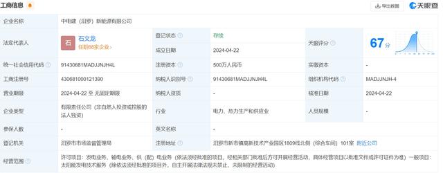 4月22日,中电建(汨罗)新能源有限公司成立,法定代表人为石文龙,注册资本500万人民币,经营范围涉及到发电业务、输电业务、供(配)电业务,太阳能发电技术服务等。