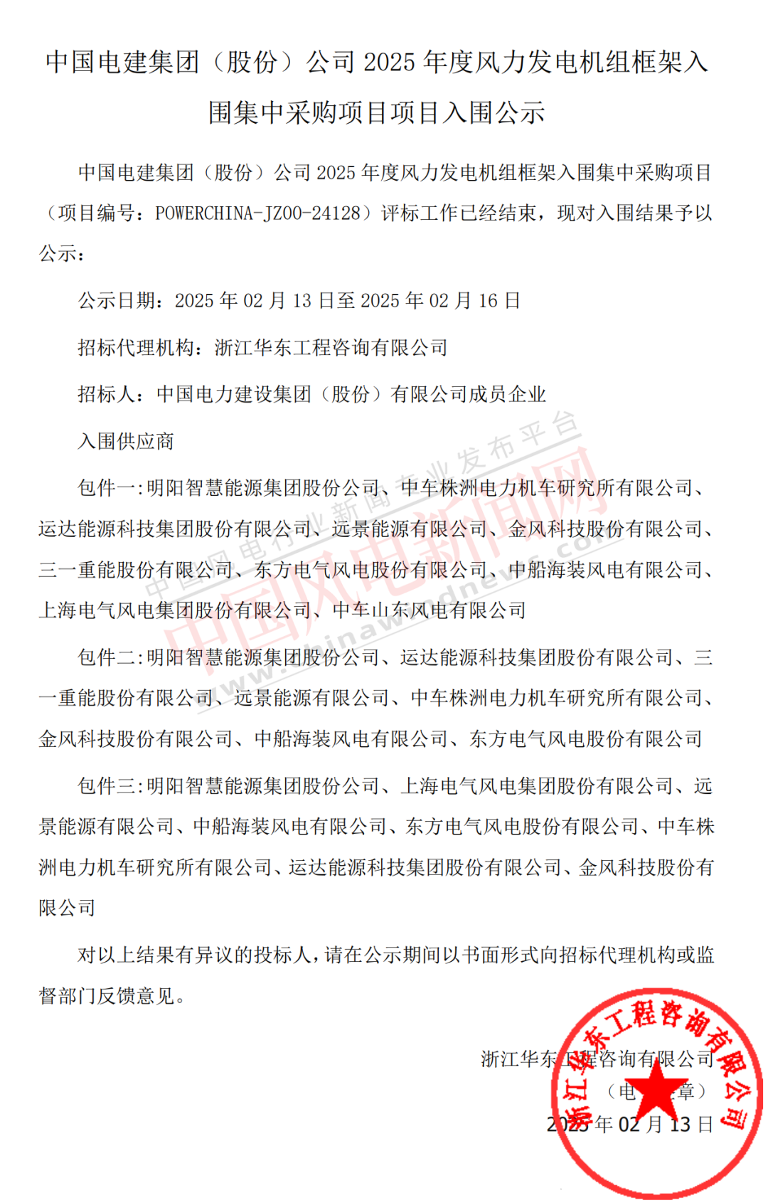 2月13日,中国电建集团(股份)公司2025年度风力发电机组框架入围集中采购项目入围公示,采购规模共计25GW,其中陆上总量预计为23GW,海上总量预计为2GW。金风科技、远景能源、明阳智能、三一重能、运达股份、东方风电、中船海装、电气风电、中车株洲所、中车山东风电10家整机商入围。