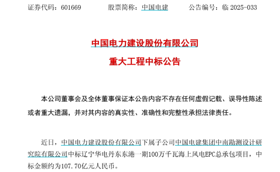 6月12日,中国电建发布公告称,下属子公司中南勘测设计研究院中标辽宁华电丹东东港一期100万千瓦海上风电EPC总承包项目,中标金额约为107.7亿元人民币。