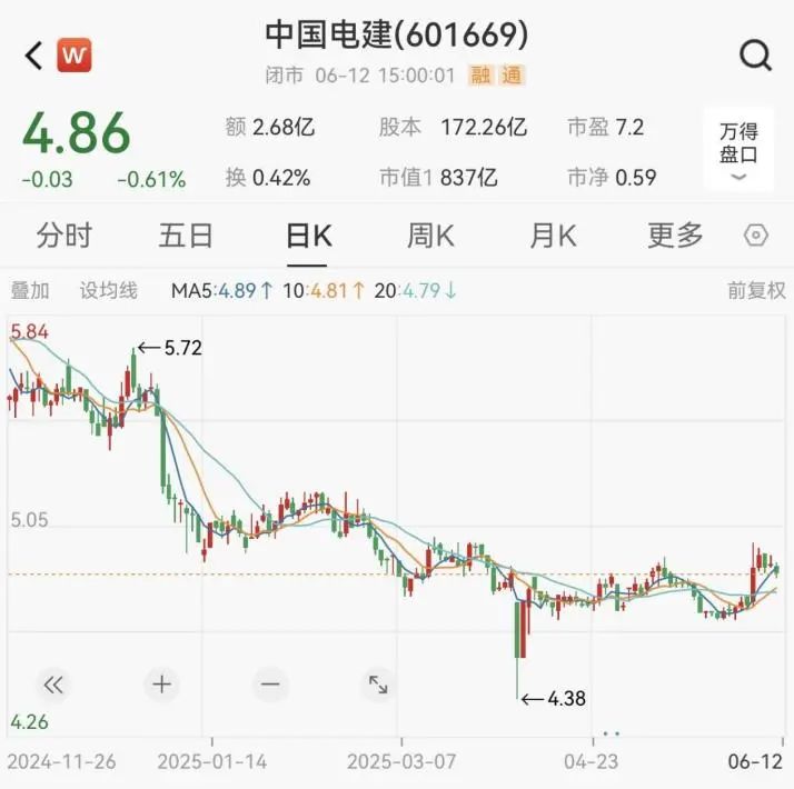 截至6月12日收盘,中国电建股价报4.86元/股,总市值为837亿元。