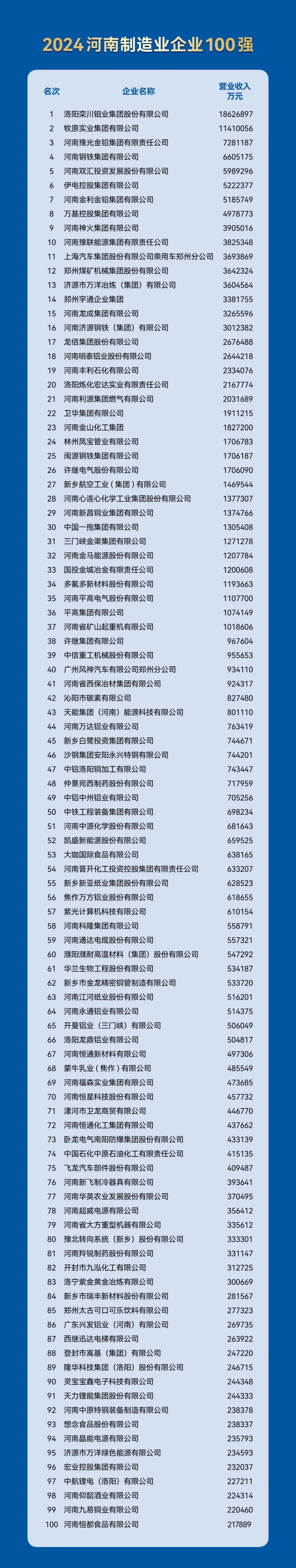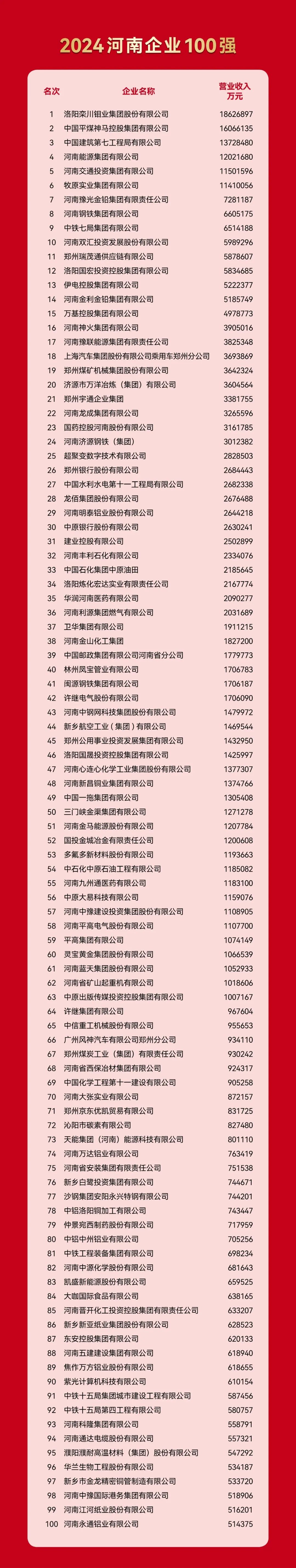 11月1日,由河南省企业联合会、河南省企业家协会主办的2024河南企业100强高峰会在平顶山市召开,大会发布了“2024河南企业100强”、“河南制造业企业100强”等系列榜单。