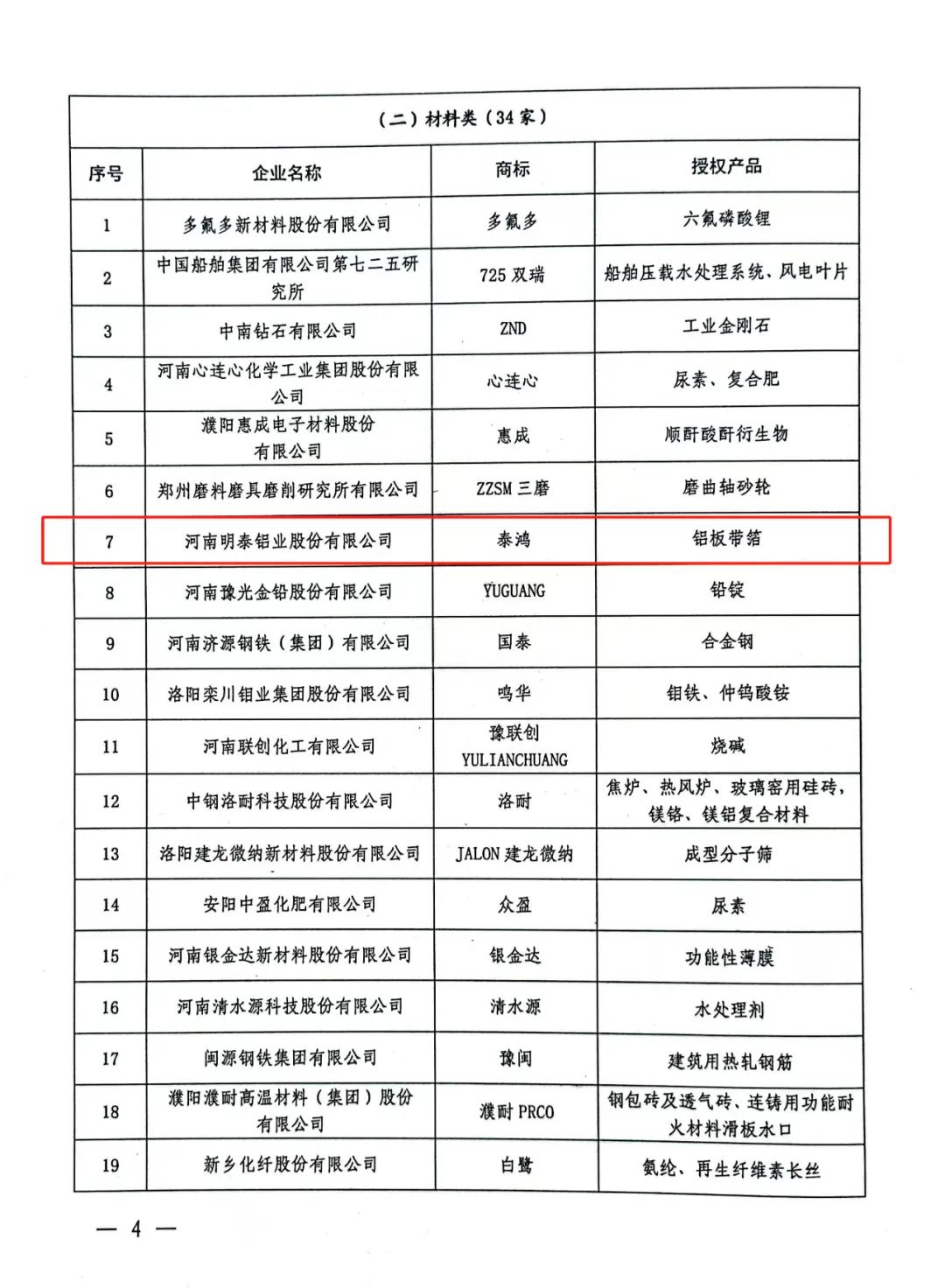 1月9日,河南省质量强省战略工作领导小组办公室在郑州召开河南省首批“美豫名品”发布活动,明泰铝业成功登榜河南省首批授权使用“美豫名品”企业名单。