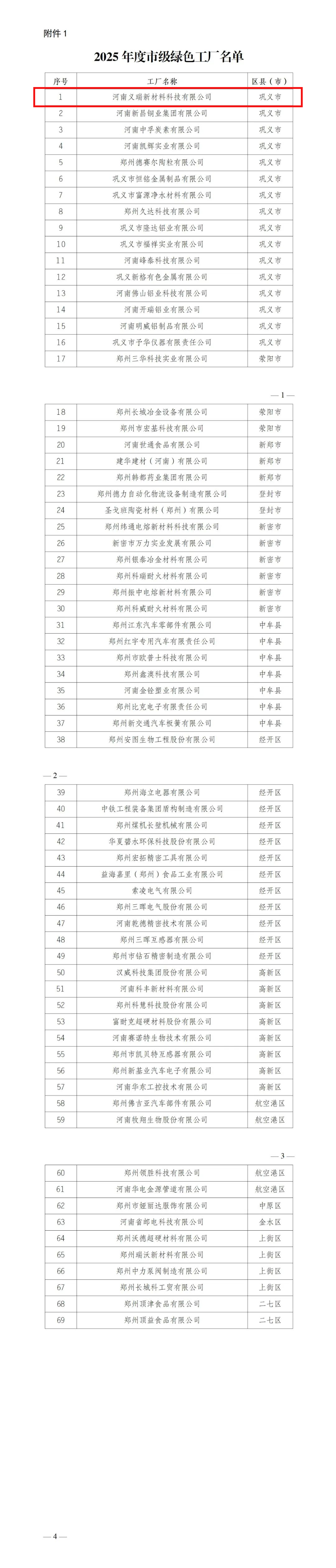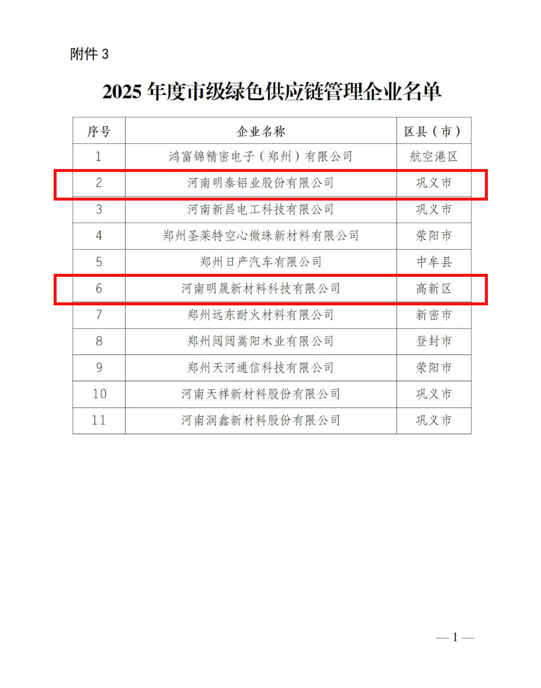 近日,郑州市工业和信息化局公布 2025 年度绿色制造名单。河南义瑞新材料科技有限公司入选郑州市“绿色工厂”名单,河南明泰铝业股份有限公司、河南明晟新材料科技有限公司入选郑州市“绿色供应链管理企业”名单。此次荣膺多项绿色制造殊荣彰显了明泰铝业在绿色制造领域的卓越实力。