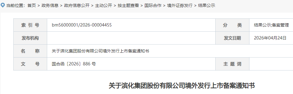 2026年4月24日,中国证监会国际合作司发布关于滨化集团股份有限公司境外发行上市备案通知书(国合函[2026]886号)。