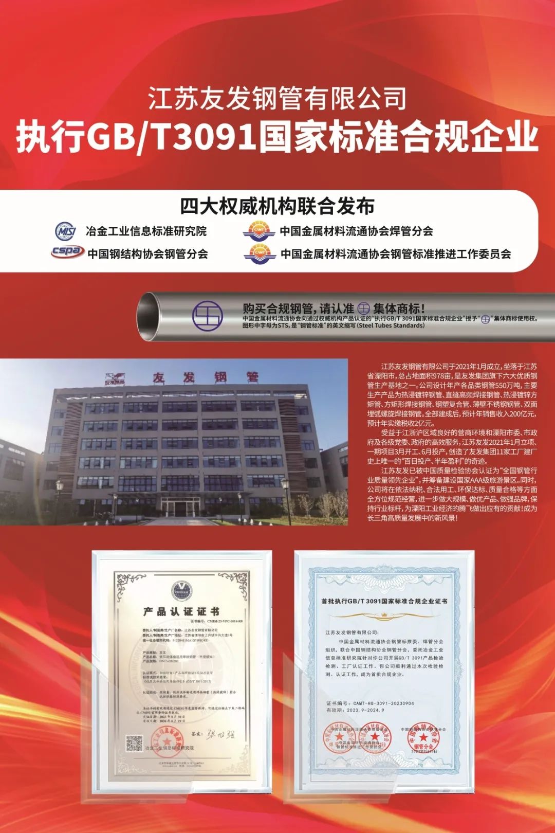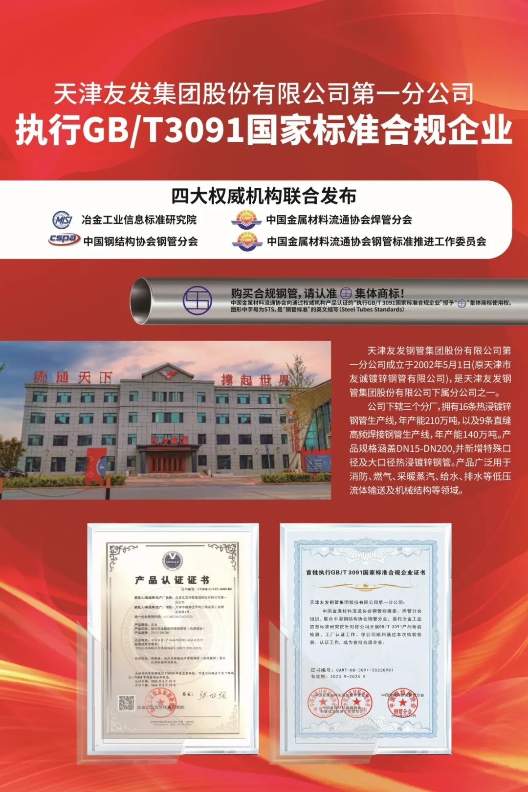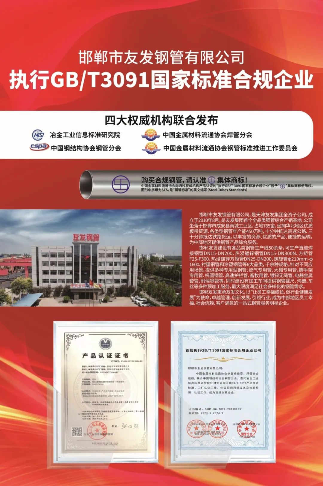 10月16日,由四大权威机构联合发布的首批入围《执行GB/T 3091国家标准合规企业名录》的14家企业中,有5家为友发集团旗下企业。分别为友发集团第一分公司、唐山正元管业、邯郸友发、陕西友发和江苏友发,涵盖友发集团全部镀锌圆管产品。