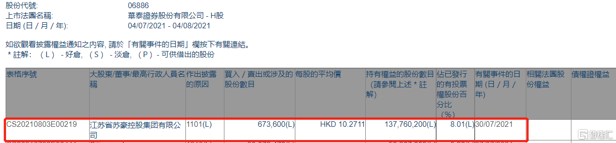格隆汇APP获悉,根据联交所最新权益披露资料显示,2021年7月30日,华泰证券(06886.HK)获江苏省苏豪控股集团有限公司在场内以每股均价10.2711港元增持67.36万股,涉资约691.86万港元。
