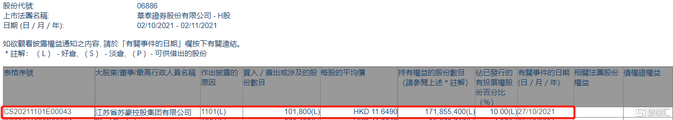格隆汇APP获悉,根据联交所最新权益披露资料显示,2021年10月27日,华泰证券(06886.HK)获江苏省苏豪控股集团有限公司在场内以每股均价11.649港元增持10.18万股,涉资约118.59万港元。