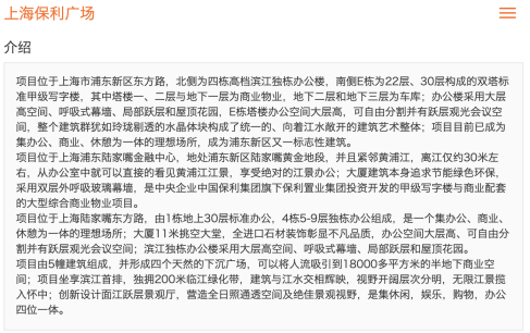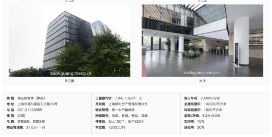该网站还显示,上海保利广场竣工于2009年2月,日租金均价为每天7.9-8.1元/平方米,物业管理费为每月31元/平方米。