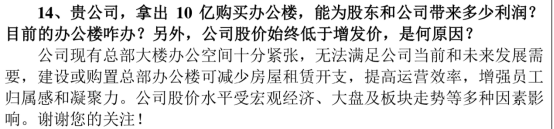 根据长江证券今年6月28日公告的《投资者关系活动记录表》,有投资者在网上集体接待日发出“灵魂拷问”:“贵公司拿10亿元购买办公楼,能为股东和公司带来多少利润?目前的办公楼咋办?”