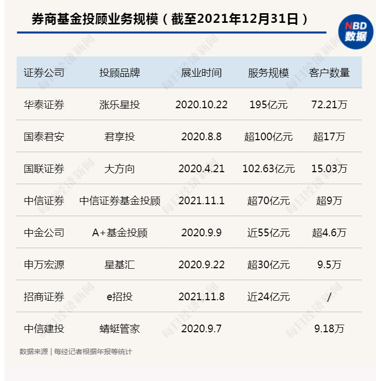 统计显示,截至去年年底,华泰证券、国联证券等3家券商基金投顾业务的规模都已破百亿元,其中华泰证券基金投顾业务规模已达到了195亿元,成为首家基金投顾业务规模逼近200亿元的券商。