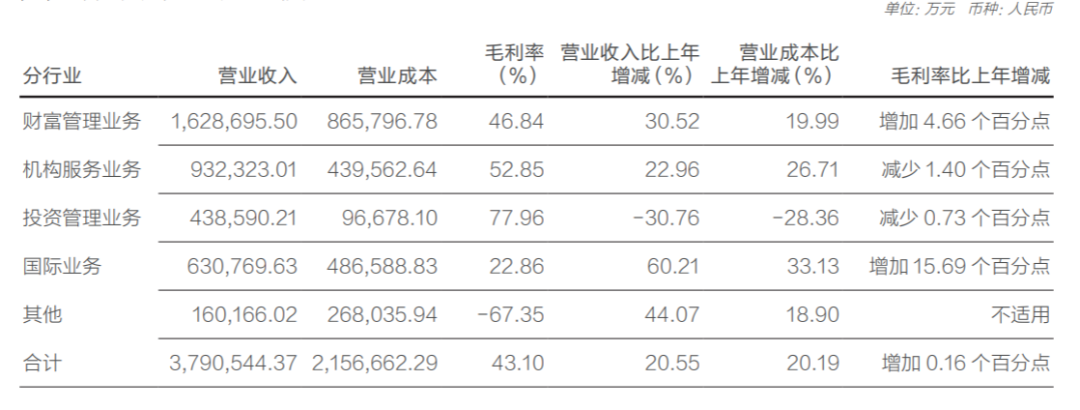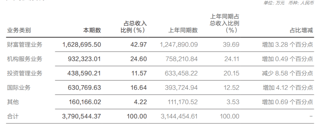 从主营业务收入结构看,财富管理业务、机构服务业务、投资管理业务和国际业务在2021年营业收入占总收入比例分别为42.97%、24.60%、11.57%、16.64%。其中,除投资管理业务收入数额、占比较2020年减少外,其他业务收入数额、占比均较2020年增加。