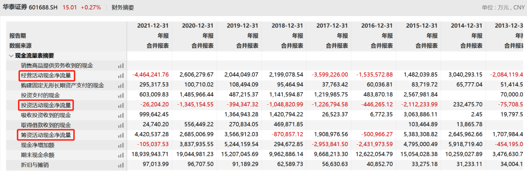 但从经营活动产生的现金流量净额看,华泰证券在第二、四季度的净额均为负值,2021年合计净额也由正转负。
