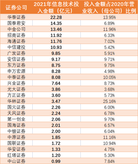 值得一提的是,按照证券业协会统计数据,2020年证券行业信息技术投入金额平均数为2.58亿元。目前,在前述记者统计的25家券商中,共有15家超过2020年的平均数。