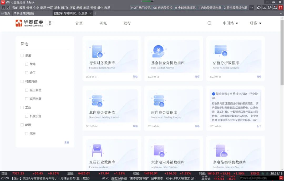 该平台遵循华泰证券公司客户白名单机制,华泰证券白名单客户可在Wind金融终端直接登陆,路径为:首页-市场-券商旗舰店-华泰证券旗舰店,或也可在搜索框内直接输入快捷命令HTZQ.M,可直接登陆华泰证券旗舰店。
