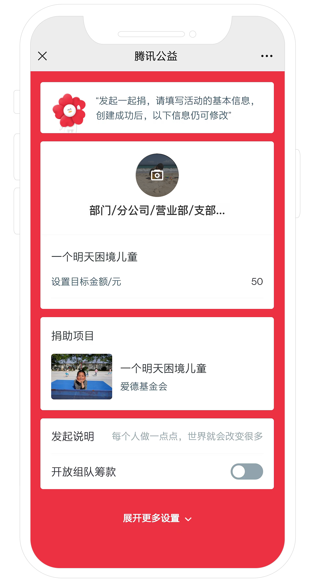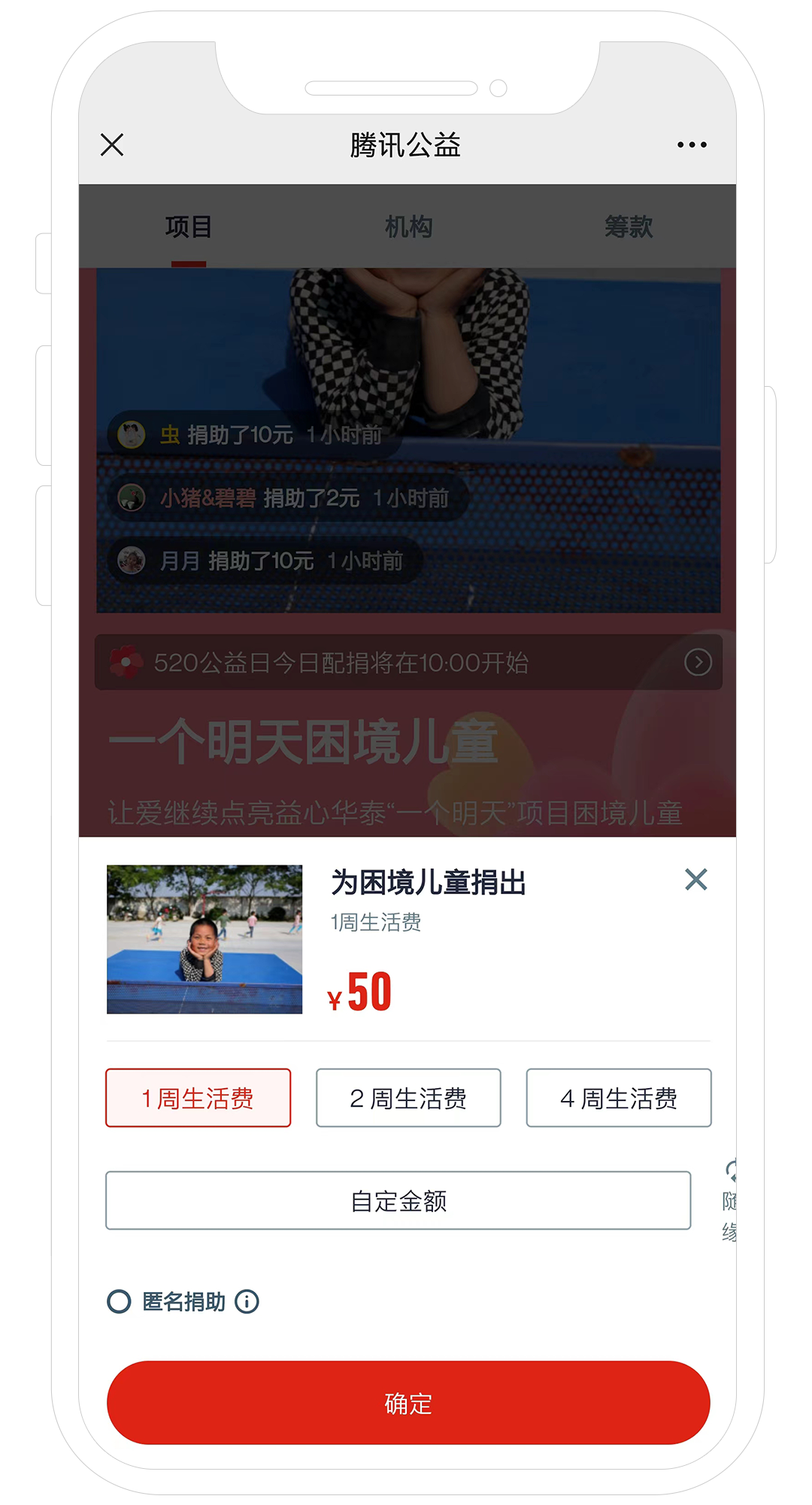 另外,您也可以通过运动的方式为困境儿童筹款,项目将于5月25日、26日在腾讯公益“一块走”小程序上线,只需搜索“一块走”小程序,且活动当天被“微信运动”记录的步数超过6000步,即可兑换“一个明天”项目善款。也可在“一块走”小程序中“建立小队”与小伙伴们一起为困境儿童“一块走”。
