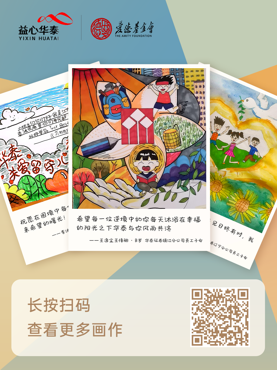华泰证券成立31周年之际,“益心华泰”公益项目团队联合爱德基金会通过腾讯公益平台发起第五期“益心华泰困境儿童资助计划”,邀请华泰员工和社会公众为200多名困境儿童筹集一年的生活补助。华泰大家庭的孩子们,也在儿童节前夕用手中的画笔绘制筹款海报,让更多人内心的善意跨越空间,变成远方的希望,连接着彼此。同时,华泰证券通过华泰公益基金会捐赠项目运营费用,用于逐一核实拟资助对象经济情况等必须的项目运行开支。