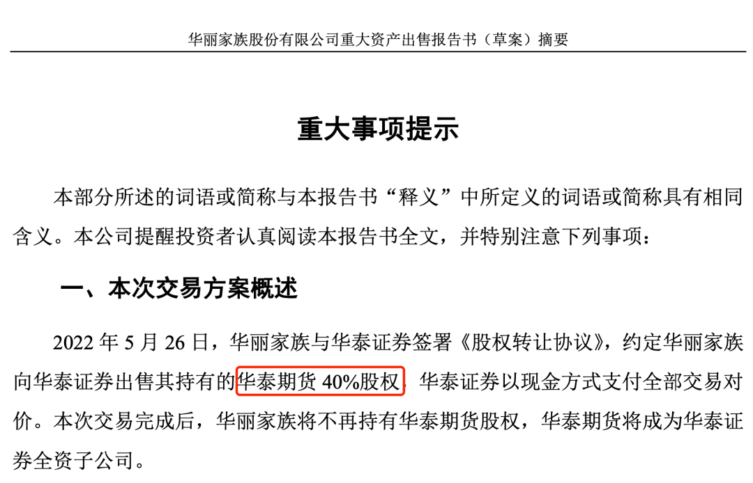 公告显示,5月26日当天,华泰证券与华丽家族签署了《股权转让协议》,约定华丽家族向华泰证券出售其持有的华泰期货40%股权,华泰证券以现金方式支付全部交易对价。本次交易完成后,华丽家族将不再持有华泰期货股权,华泰期货将成为华泰证券全资子公司。
