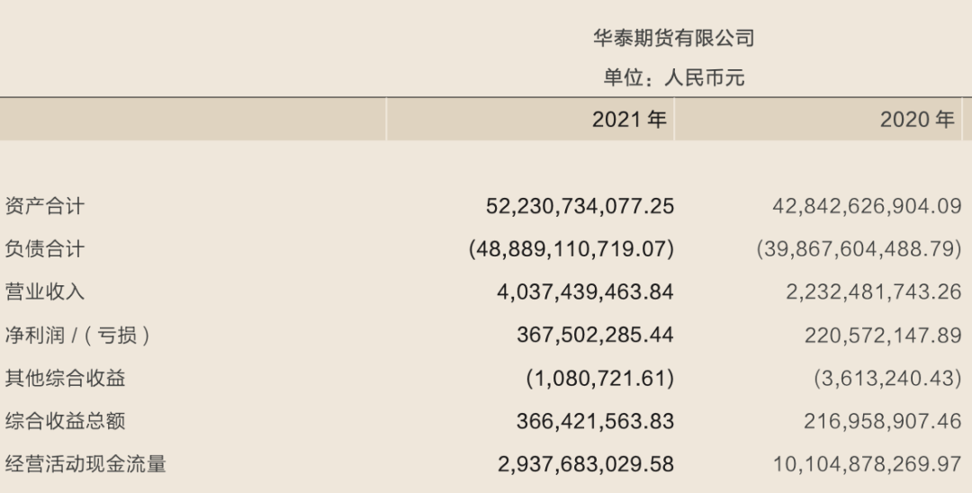 2021年,华泰期货实现营收40.37亿元,同比增长81%,实现净利润3.68亿元,同比增长67%。