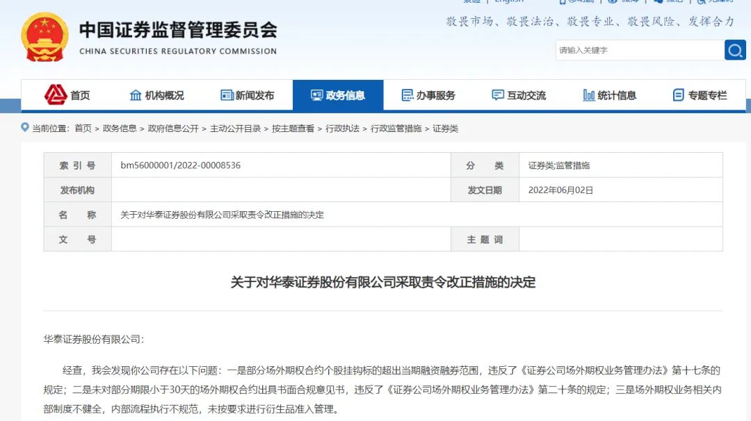 根据“罚单”,中国证监会对华泰证券表示,经查,我会发现你公司存在以下问题:一是部分场外期权合约个股挂钩标的超出当期融资融券范围,违反了《证券公司场外期权业务管理办法》第十七条的规定;二是未对部分期限小于30天的场外期权合约出具书面合规意见书,违反了《证券公司场外期权业务管理办法》第二十条的规定;三是场外期权业务相关内部制度不健全,内部流程执行不规范,未按要求进行衍生品准入管理。