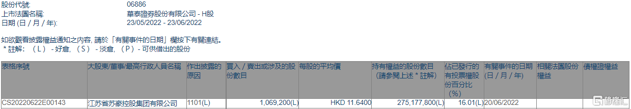 根据联交所最新权益披露资料显示,2022年6月20日,华泰证券(06886.HK)获江苏省苏豪控股集团有限公司在场内以每股均价11.64港元增持106.92万股,涉资约1244.55万港元。