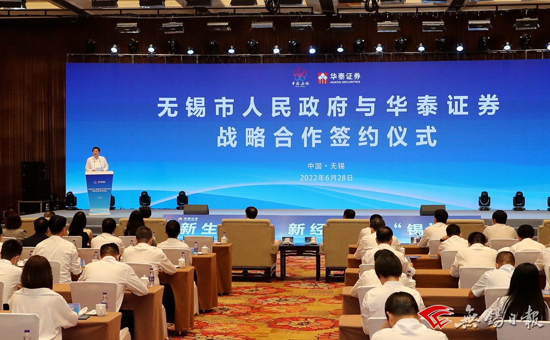 赵建军感谢华泰证券一直以来给予无锡经济社会发展的大力支持。他说,华泰证券不仅综合实力和品牌影响力位居国内第一方阵,而且与无锡有着深厚渊源、深入对接、深度合作,是无锡高质量发展的有力“助推器”。当前,无锡正聚焦稳定经济运行、加快项目建设、推动科技创新“三个维度”,努力当好全省稳住经济大盘的“重要压舱石”,更加需要华泰证券的鼎力支持。希望双方以此次签约为新起点,真诚合作、携手向前,在推进上务“实”,建立常态沟通、定期会商、动态评估机制,推动各项合作早落地、快见效;在支撑上更“准”,更好服务企业上市、服务上市企业,积极提供“定制版”“专享版”金融服务,精准推动产业与资本的深度融合;在合作上求“深”,围绕做强现代产业核心链条、做大科技创新关键变量、激活数字经济关键增量等深化合作,实现更大互利共赢。“希望广大企业家,借助资本东风、展现发展雄风,当好无锡产业强市的‘中流砥柱’!”