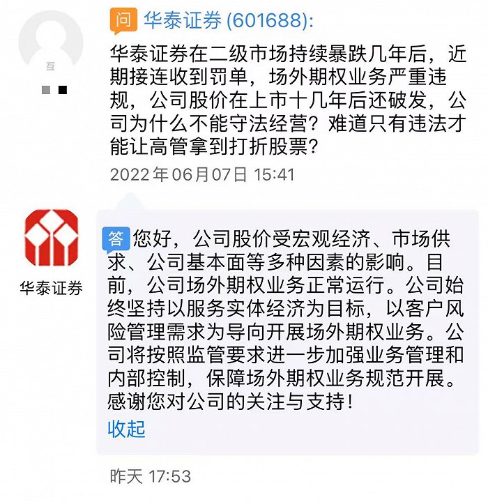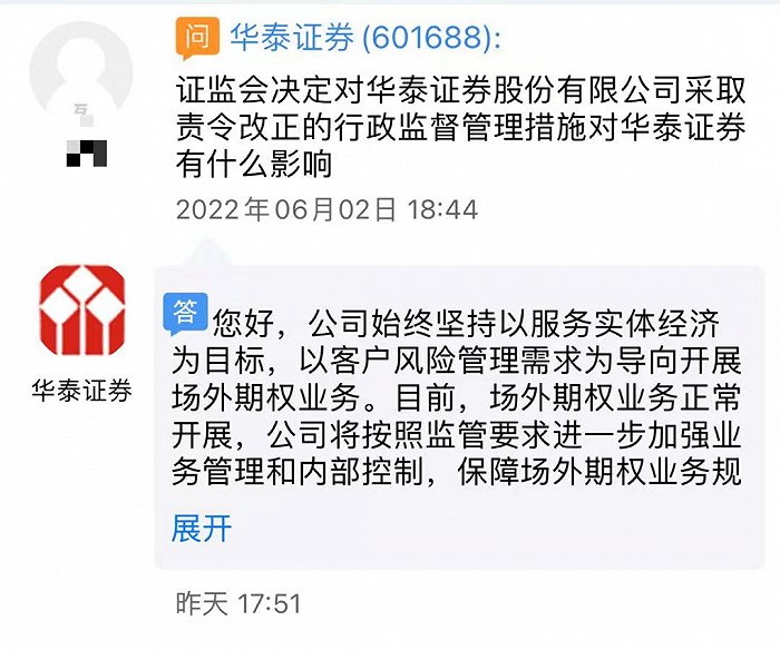 上述投资者提及的罚单可追溯至上个月。6月2日,证监会指出华泰证券场外业务存在三项违规,并对其采取责令改正的监管措施:一是部分场外期权合约个股挂钩标的超出当期融资融券范围;二是未对部分期限小于30天的场外期权合约出具书面合规意见书;三是相关内部制度不健全,内部流程执行不规范,未按要求进行衍生品准入管理。