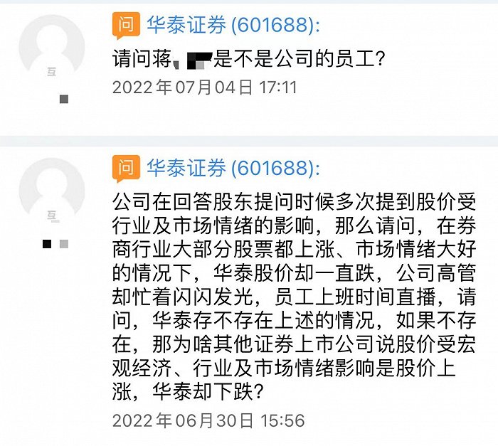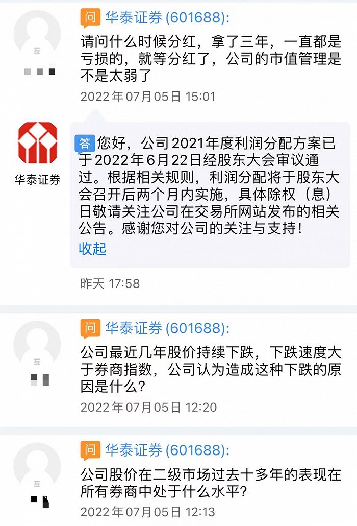 以上质询或主要来自于投资者对于华泰证券股价和分红问题的担忧。有多名投资者在互动页面直言公司股价下跌并迟迟未见分红日程安排。