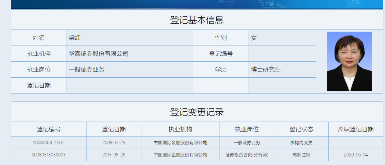 《每日经济新闻》记者联系华泰证券(SH601688,收盘价13.60元,总市值:1234亿)相关人士进行求证,截至发稿时未获回应。目前上交所网站也未发布相关公告。但记者从中证协从业人员管理平台上查询得知,梁红的工作单位已更新至华泰证券。