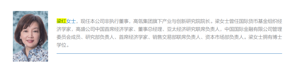 2008年,梁红从高盛亚太区离职,加入中金公司(SH601995,收盘价:42.44元,总市值:2049亿),曾担任中金公司资本市场部董事总经理,中金公司研究部负责人。2014年10月10日,中金公司宣布任命中金公司研究部负责人梁红兼任中金公司首席经济学家。2020年6月,梁红离开中金公司,并于7月加入高瓴集团。